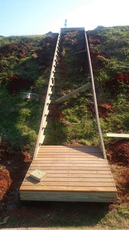 These balau timber stairs that we built in Umhlanga are actually temporary stairs which will be removed at some point. They were built in order to gain access up the bank to a converted container that has been placed at the top.