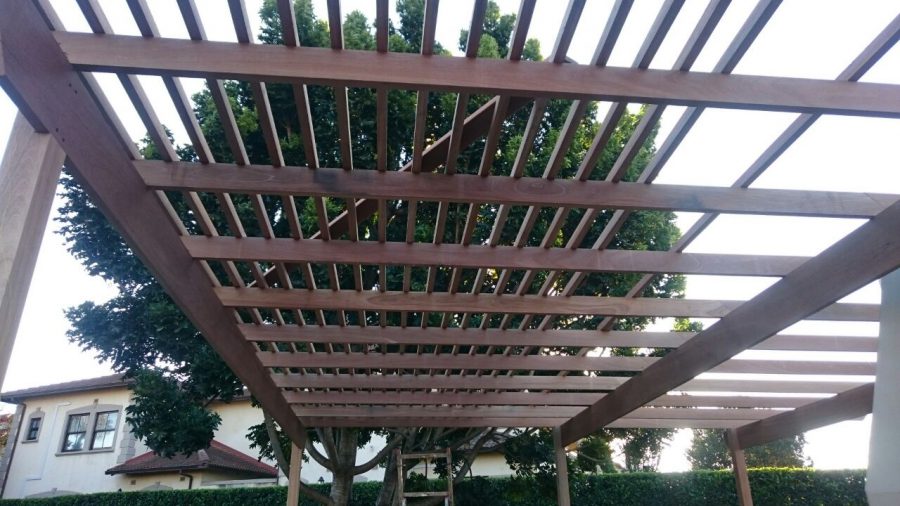 This wooden balau pergola was built at Plantations in August 2016. We had custom-made galvanised steel base plates made up in order to secure the uprights to the existing paving.