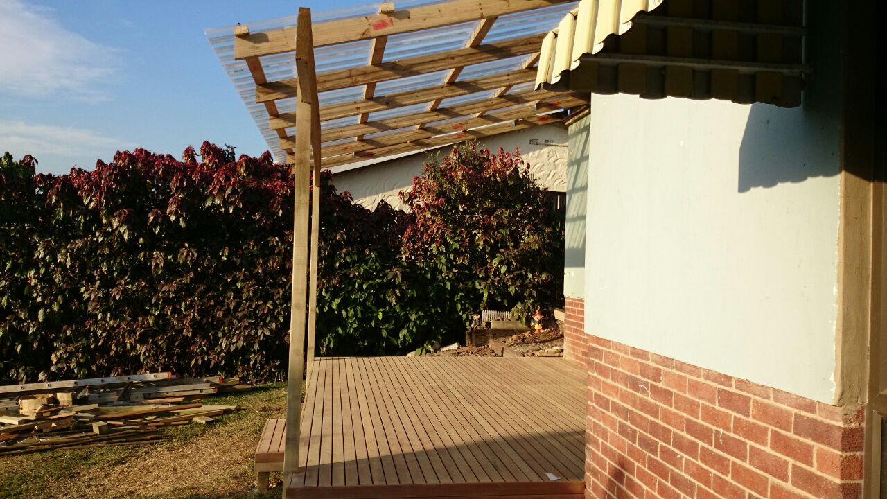 Wooden balau deck built in Malvern, DurbanWe added 50 x 76 purlins and covered that with clear polycarbonate roof sheeting. This allowed the light to still get in but it will be protected from rain. This roof sheeting is however not that attractive from beneath so we clad the underside with thatching laths with no gap between them. I’ve tried building one of these before with a laths gap between laths, but it doesn’t work as you can then see the roof sheeting clearly. Because the laths are not a regular uniform thickness all the way along, you still do get some gaps, even if placing them side by side, which allows light through but takes away the view from beneath of the roof sheeting.