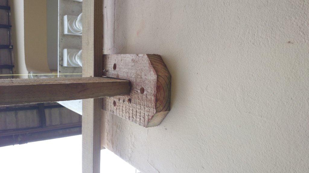 With the steel gone, we set out to build a wooden stair case and landing that could act as a fire escape. The small landing part was easier enough and we canter levered it so as to keep our posts out of the way below for parking. In these smaller blocks of flats in Durban space is very limited so posts need to be kept well out the way of parking space. Because we were canter levering it we needed to use 30 x 140 joists of balau rather than our normal 30 x 102 joists.