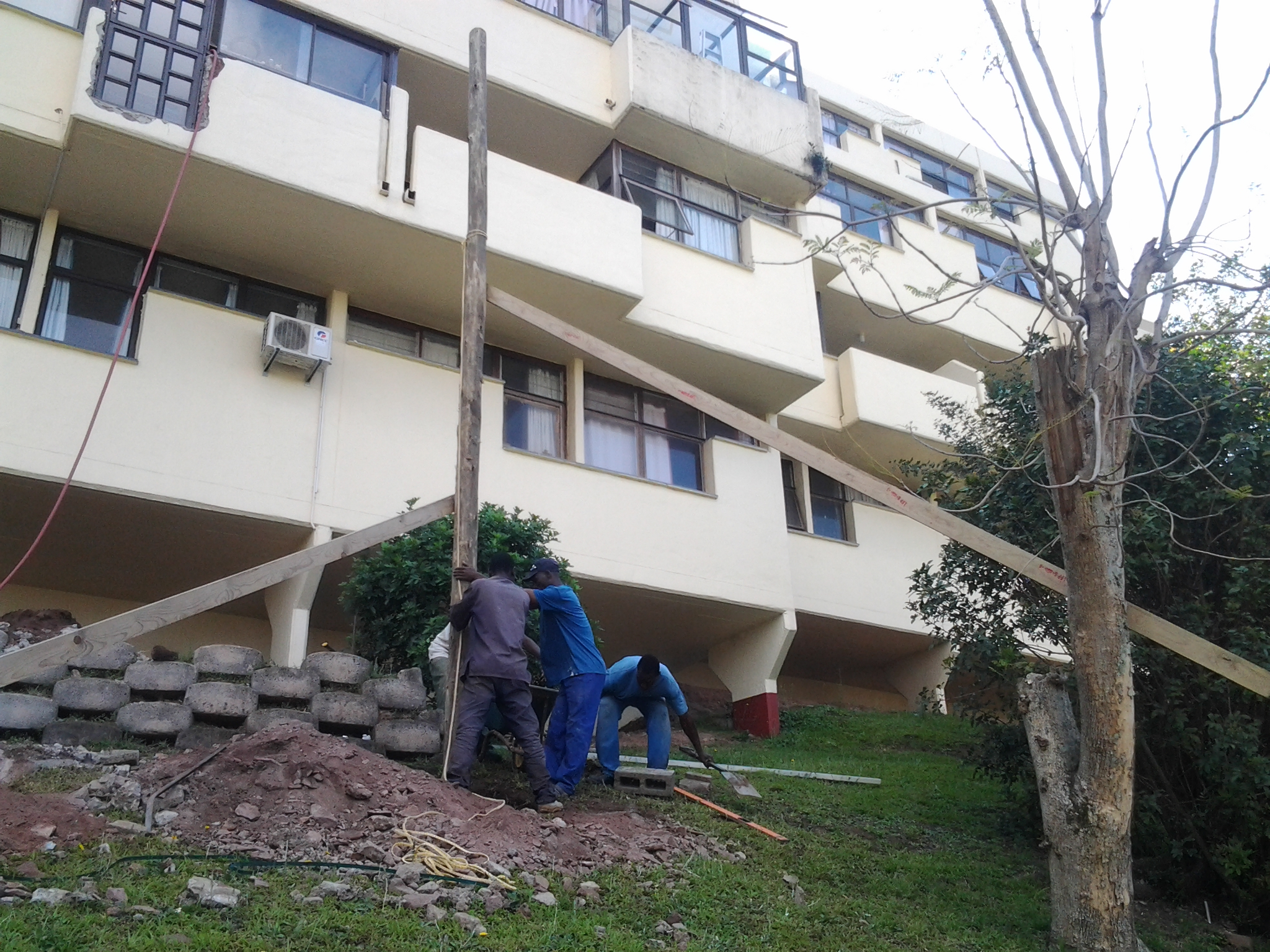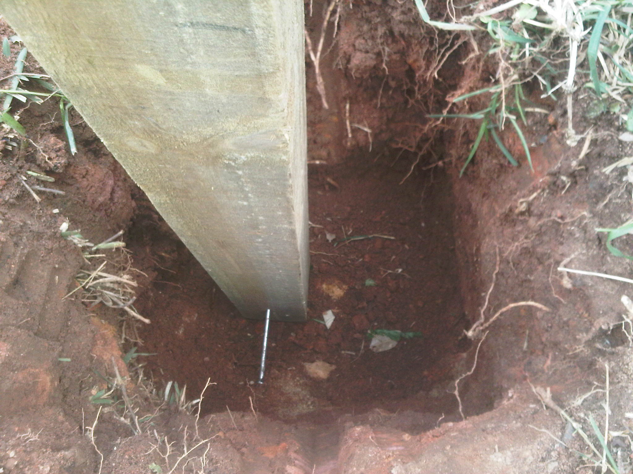 We also take pictures of us planting the posts or poles so that it is clear we have planted them correctly. When one plants a post, it should always be placed on top of soil and then concrete placed around the post. If you wish to place it on top of concrete than that concrete should be allowed to set completely before placing the post and setting it in concrete. This is to allow any water that does get into the post to escape through the bottom of the post. If a post is set on top of wet concrete it will slow the escape of water through the pole and this will speed up the rotting process from within the posts. I’m sure you’ve seen some gum poles that have rotted from the inside out. This is because they have probably been set on top of wet concrete.